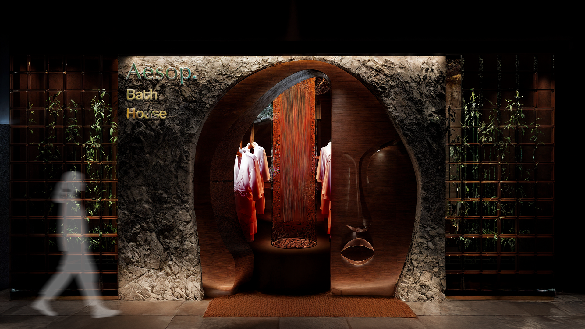 Concept for a niche Aesop boutique focused on bathrobes and bath products, designed as a premium, multisensory space
